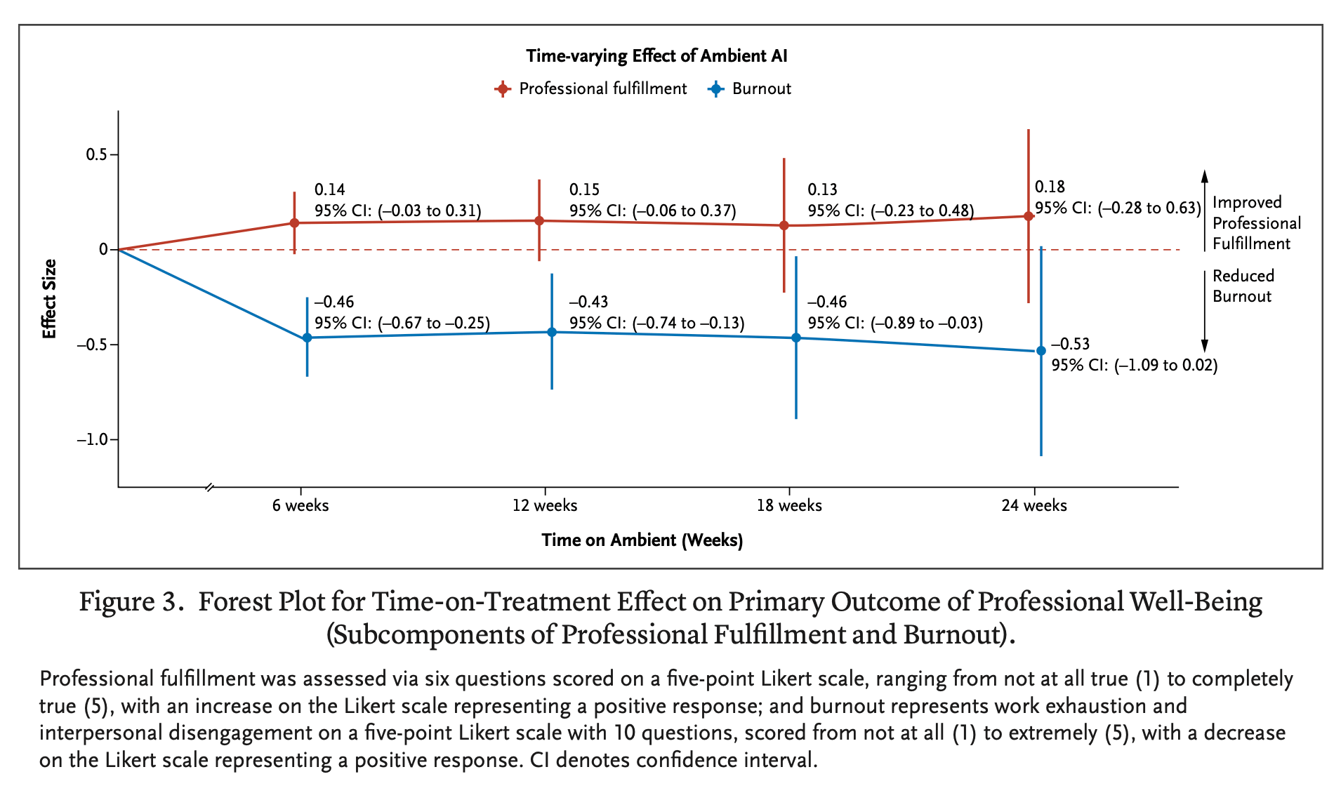 Ambient AI scribes reduced documentation time and work exhaustion for outpatient clinicians.