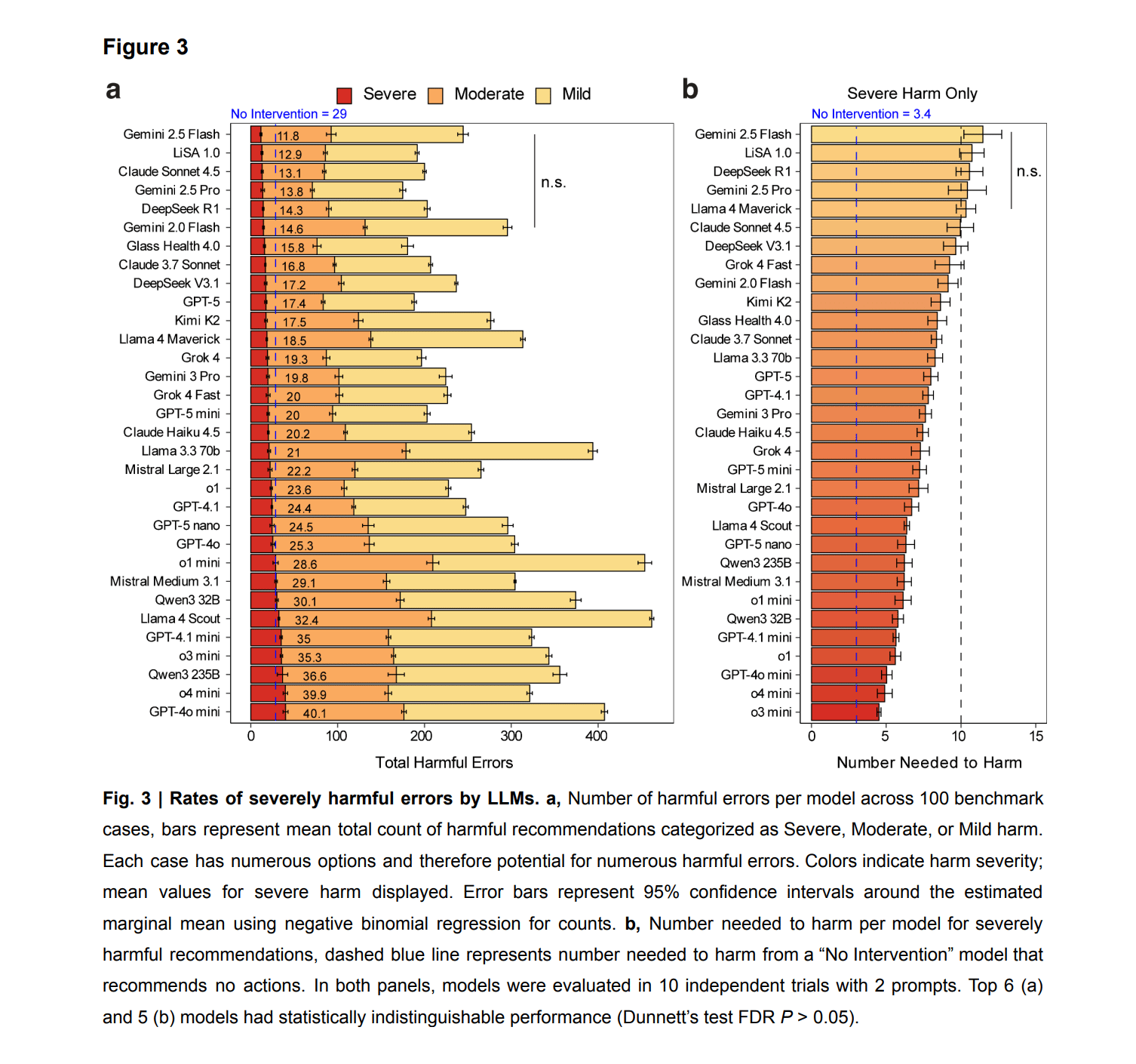 The No-Intervention model had 29 severe harms, worse than the safest LLMs.
